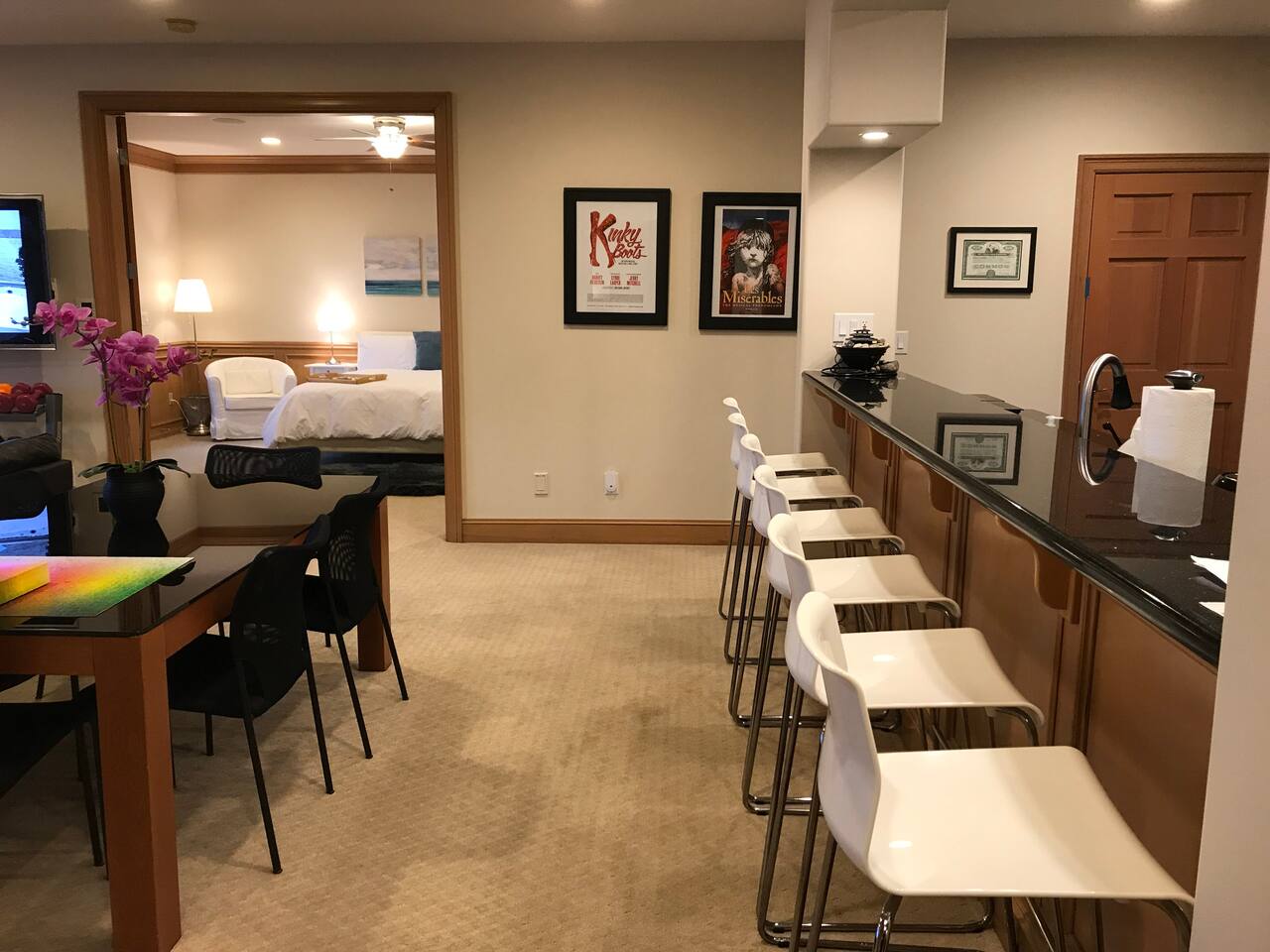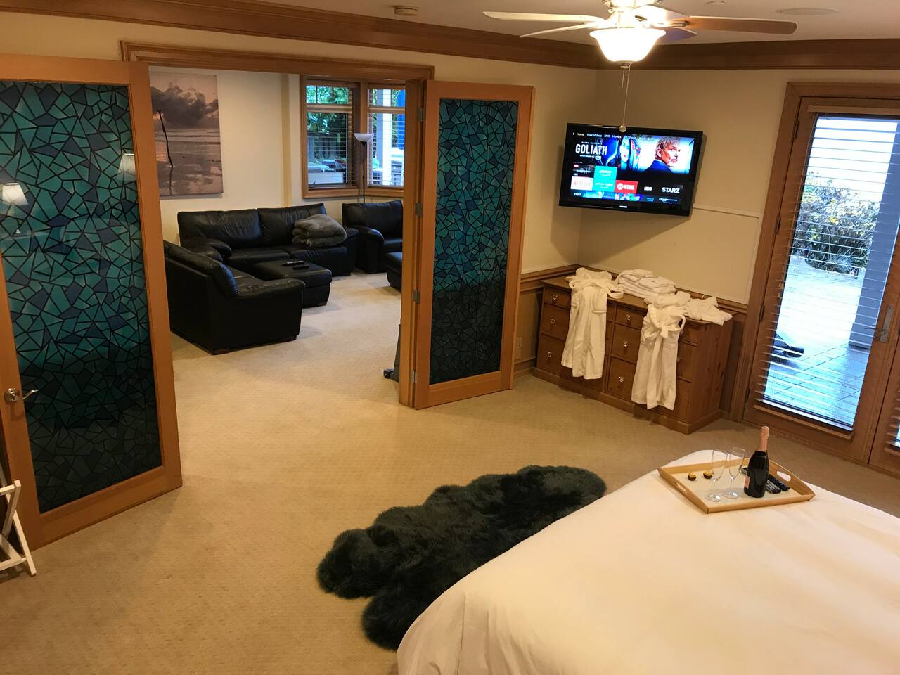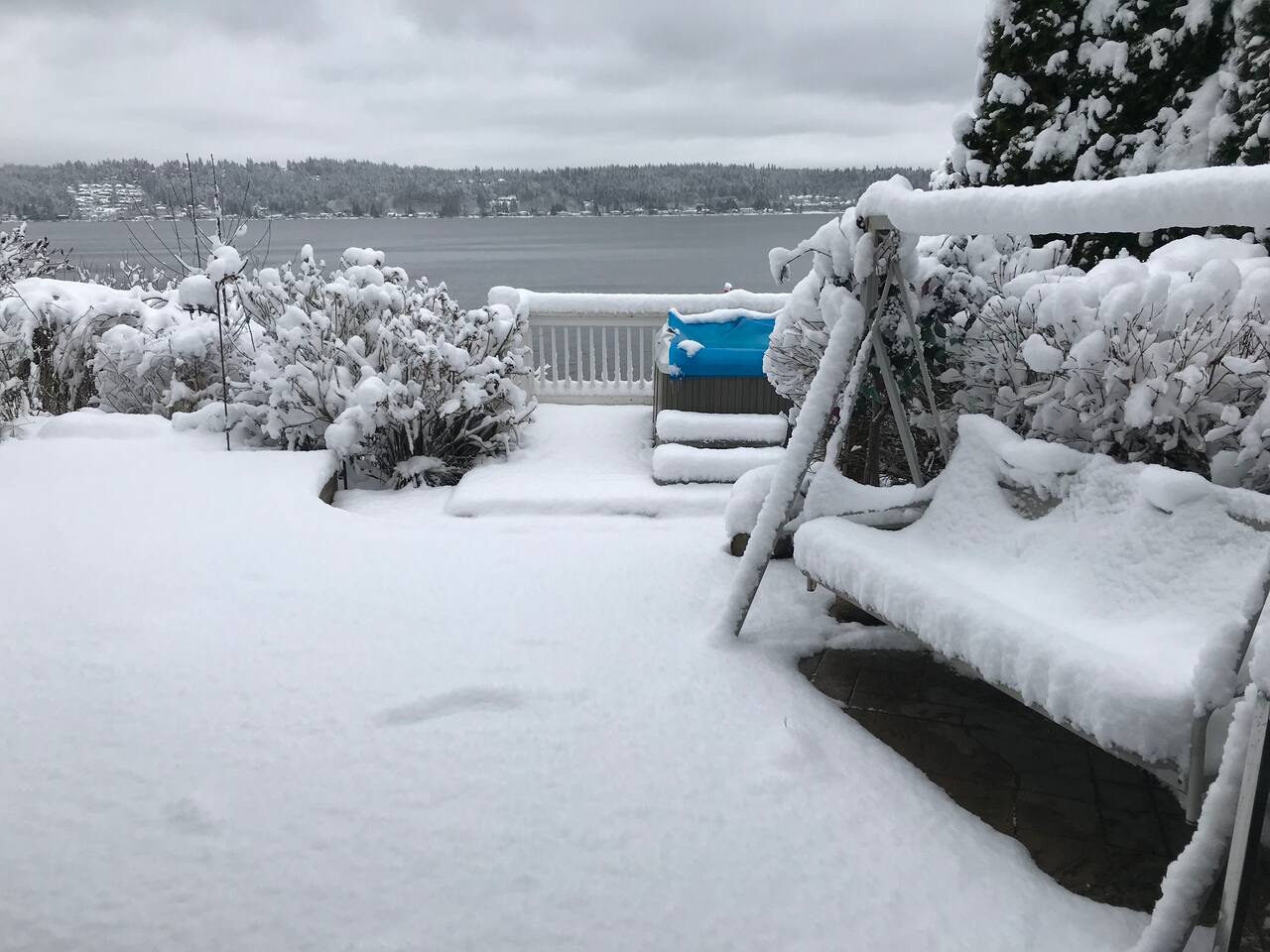 Beautiful, self‑contained apartment featuring three bedrooms (King master suite, additional King bedroom, and a Queen bedroom) and two bathrooms, including a private ensuite in the master. The second bedroom includes a Peloton Bike, and guests also have access to weights and a balance ball. Just outside the master suite—under cover—you’ll find Life Fitness equipment (T3 treadmill, X3 elliptical, and C3 bike) for all‑weather workouts. The apartment opens to a large outdoor area with a dining setting, fire pit, and direct access to the garden, dock, and lake. Lake Sammamish is freshwater and safe for swimming, with warm temperatures in summer and serene beauty during the cooler months. A BBQ is located just outside the main door for easy outdoor cooking.