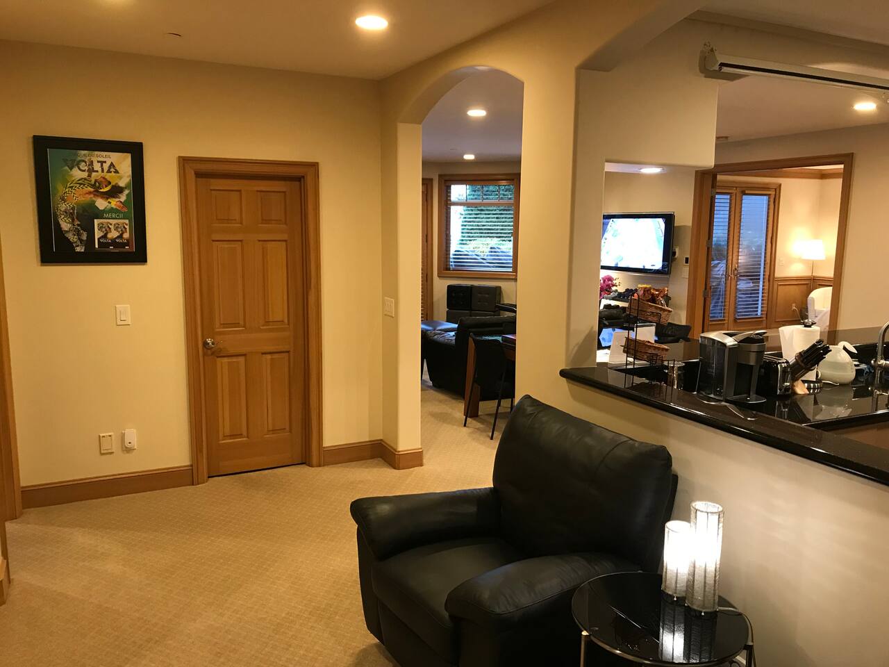 Entire lower floor (2,000 sq ft) of lakefront home. Separate entrance with amazing views. Apartment includes a Peloton bike to continue your exercise while visiting (you will need your own Peloton subscription to use or we can advise how to obtain for duration of visit). The area is totally self-contained. We live upstairs but won't disturb you. Tesla charging available. Full new kitchen added in July 2023 with full oven and induction cooktop.
